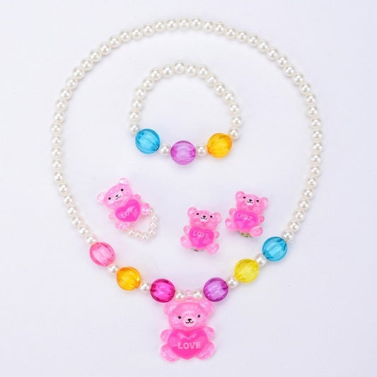 Girls Teddy Bear Pearl Beads Jewellery Set – Cute Kids Earrings, Necklace & Bracelet Set | Adorable Girls Fashion Accessories Gift!