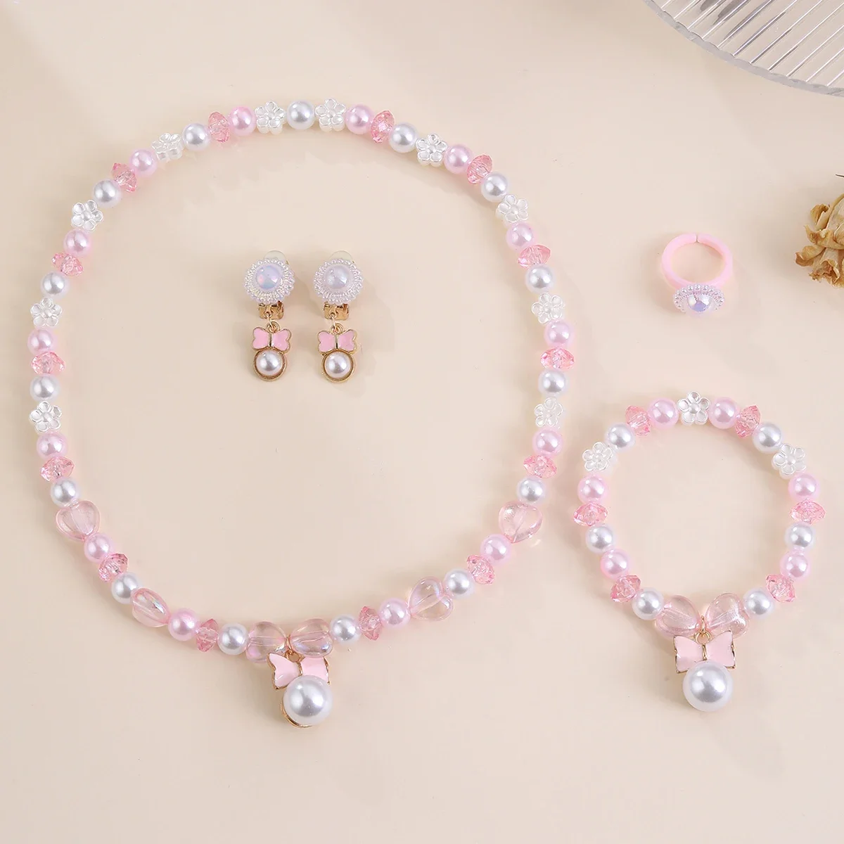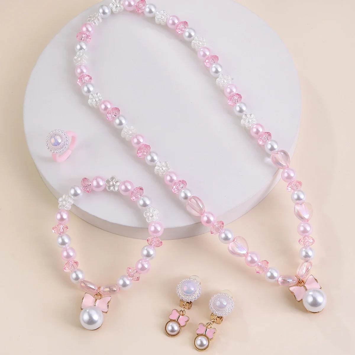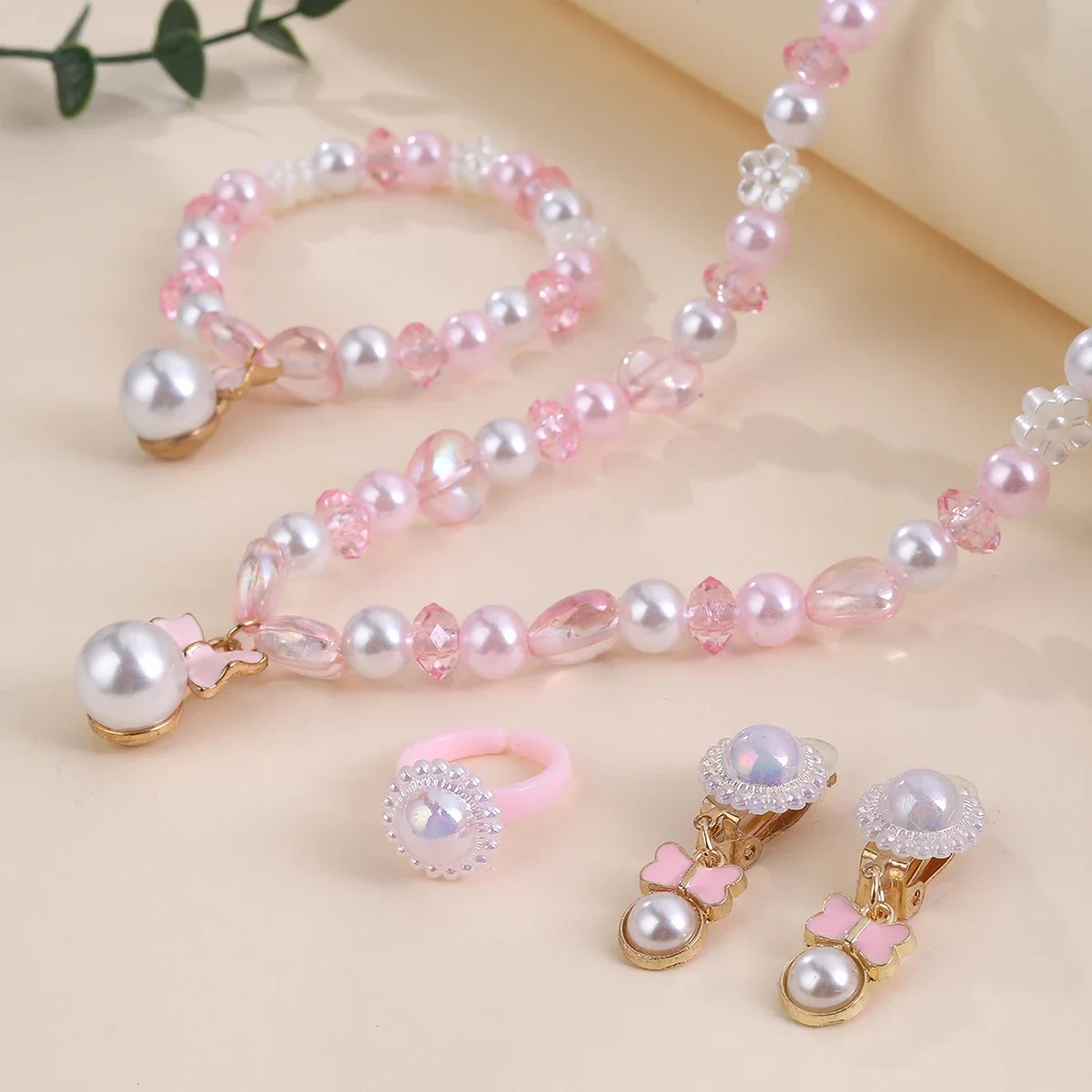 Make every celebration extra special with this adorable 5-Piece Kids Jewellery Set, beautifully designed with a pink bow pendant and pink and white imitation pearl beads. This complete matching set includes a necklace, bracelet, earrings, and ring, creating a coordinated look that little girls will love.